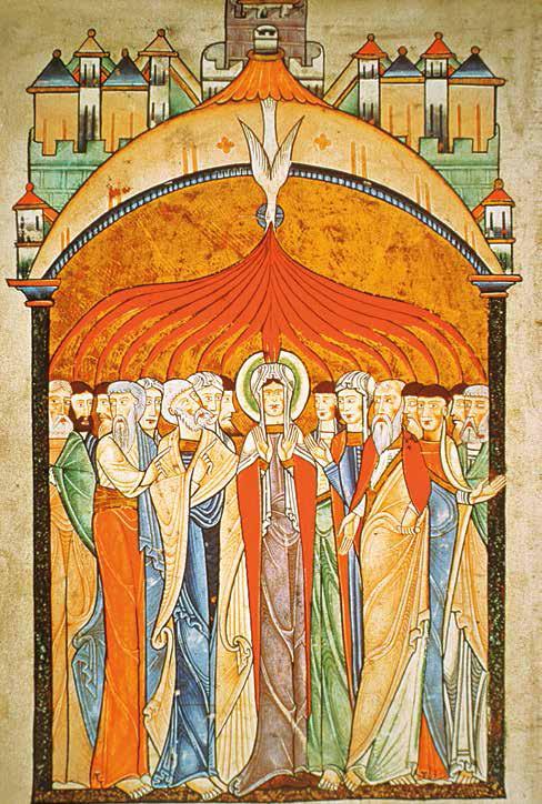 在圣灵降临之日,使徒们聚集在圣母周围,接受圣灵的恩赐。圣灵化为舌头似的火焰降临在使徒们的身上,所以圣灵降临节的礼拜仪式以红色为主,如同纪念殉教者和十字军的节日一样。前者的红色象征火,后者的红色象征血。