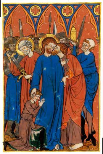 在中世纪的图片资料里,犹大的形象往往是红须红发,这象征他的邪恶本质。在这幅画里,我们观察到某种可以称为“色彩渗透”的现象:不仅犹大的形象为红须红发,即将被捕的耶稣也拥有同样的胡须和发色。我们还不清楚其中的原因是什么,但在以犹大之吻为题材的绘画作品里,这样的现象并不罕见。