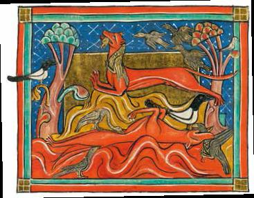 狐狸有一身砖红色的皮毛,它代表着动物中最奸诈狡猾的形象。在这幅画里,狐狸躺在地上装死,让鸟儿失去警惕而接近,然后暴起将它们捉住并吃掉。