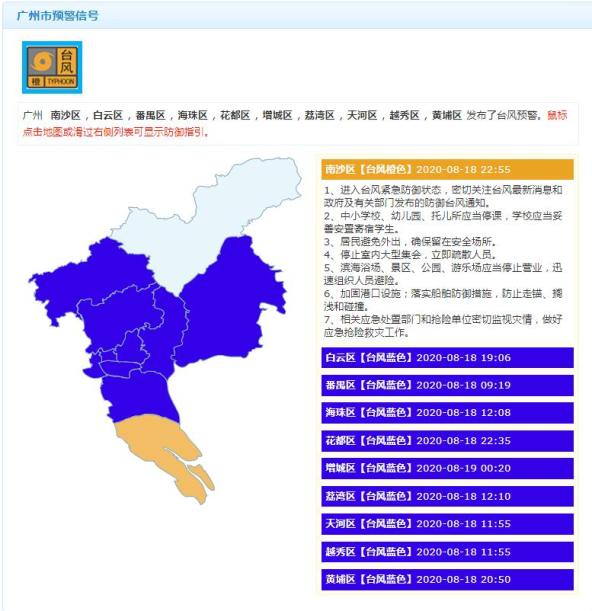 目前广州市南沙区发布台风橙色预警信号,越秀、天河、荔湾、海珠、白云、黄埔、番禺、增城区台风蓝色预警信号生效中;广州港1-2号港区台风信号3号风球、3-4号港区台风信号2号风球正在生效。