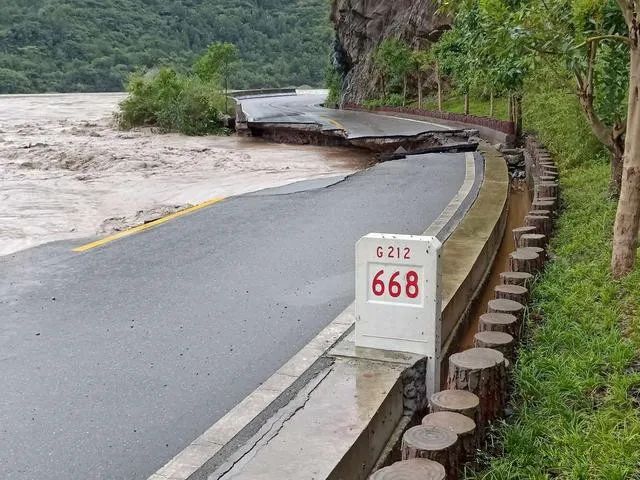 3、国道212线347KM+100M处(宕昌县甘江头乡临江河村至谢家坝路段)两处路基被水冲空,路面塌陷,暂时不具备通行条件,实行临时交通管制。