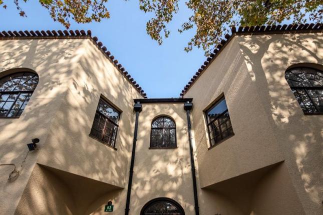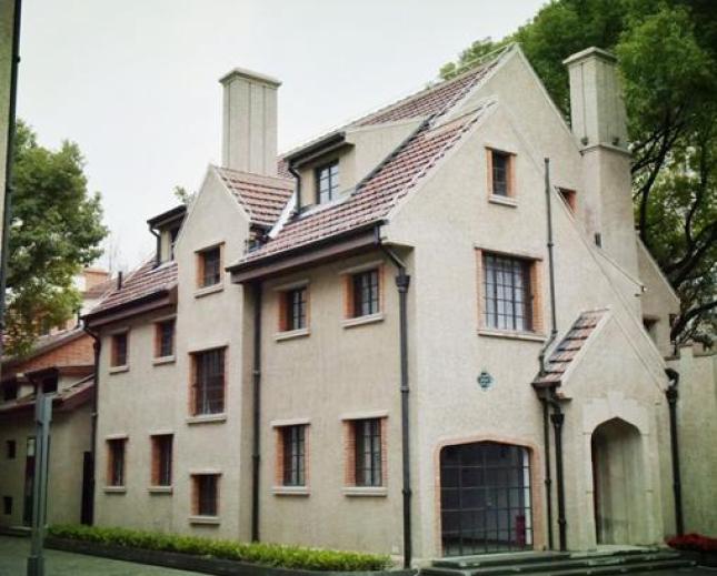 夏衍旧居建于1932年,为3层砖木结构的英国式风格花园住宅,深棕色的装饰木架、简洁几何装饰的腰线元素都体现了建筑的英式建筑风格,入口尖券门洞、绿色釉面漏窗、高耸的烟囱则是西班牙风格元素。2014年被公布为上海市文物保护单位。