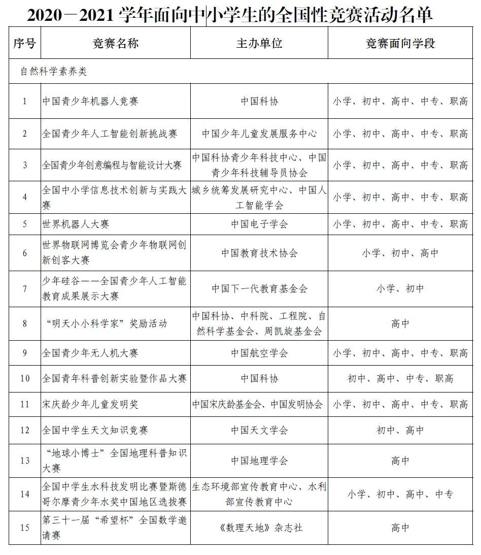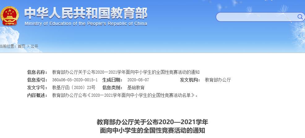 2020-2021 学年面向中小学生的全国性竞赛活动名单