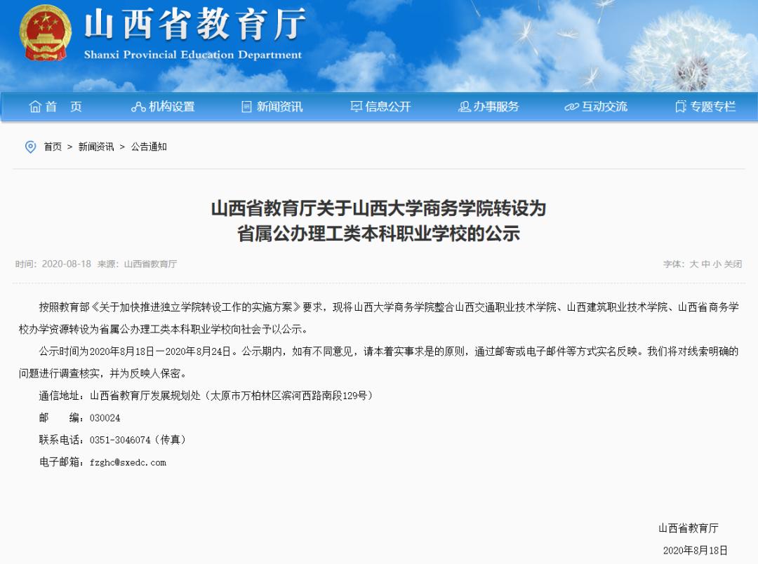 8月18日,山西省教育厅发布了《关于山西大学商务学院转设为省属公办理工类本科职业学校的公示》。
