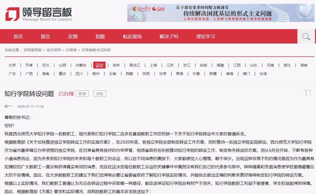 近日,网友在人民网领导留言板留言咨询西北师范大学知行学院转设事宜。官方回应将组建公办本科应用技术学院。
