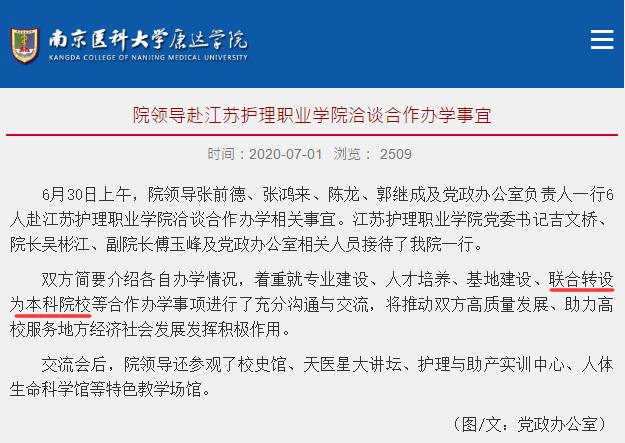 据南京医科大学康达学院官网消息,早在今年7月1日南医大康达学院领导访问江苏护理职业学院时,就提出了联合转设为本科院校的合作办学事项。