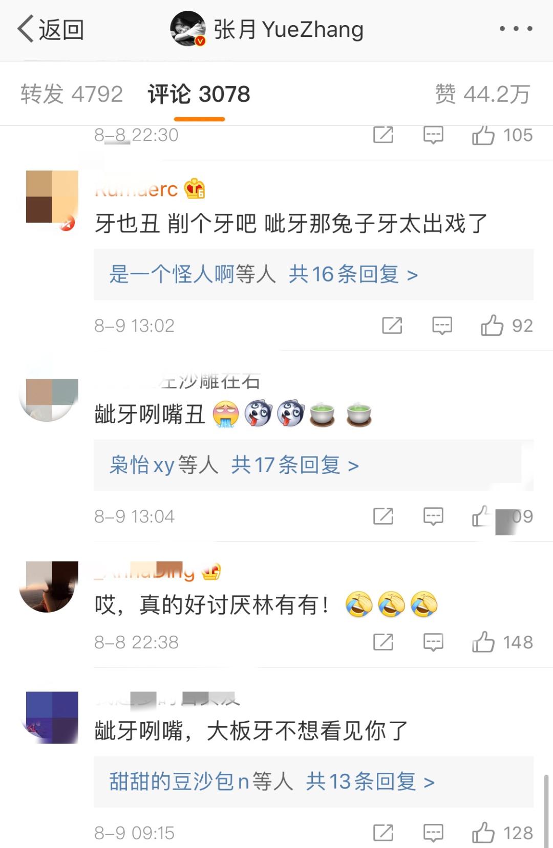 张月发了一条微博,底下就会有多条恶意评论: