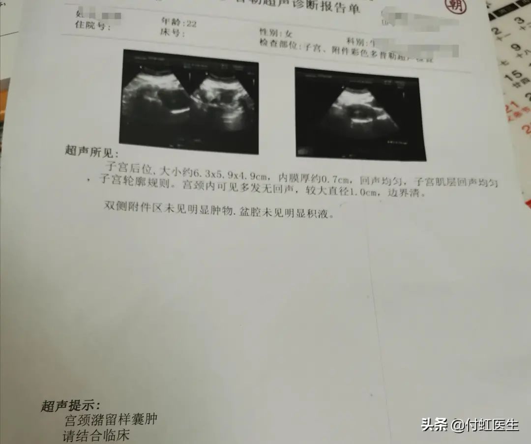 盆腔B超:子宫后位,大小6.3×5.9×4.9cm,内膜厚约0.7cm,回声均匀,子宫肌层回声均匀,子宫轮廓规则。宫颈内可见多发无回声,较大直径1.0cm,边界清。双侧附件区未见明显肿物,盆腔未见明显积液。
