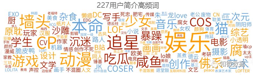 参与227事件的微博用户简介中,“娱乐”“追星”“动漫”“游戏”“写手”等词出现频率很高,同人爱好者们高举#227历史时刻#、#227大团结#话题,向肖战粉丝发起反抗。