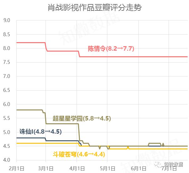 肖战的几部重要影视作品惨遭低分评价,《陈情令》豆瓣评分由8.2分降到7.7,就连肖战作为配角、出场集数屈指可数的《斗破苍穹》也被殃及。