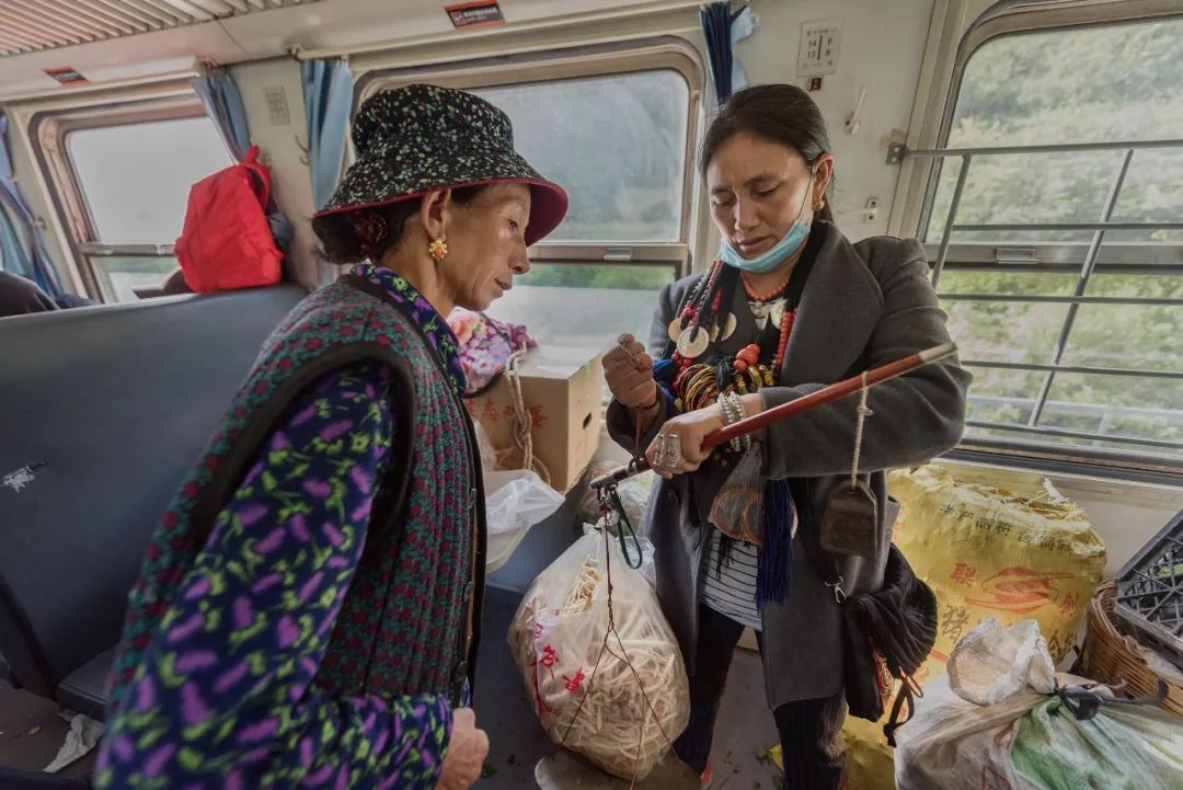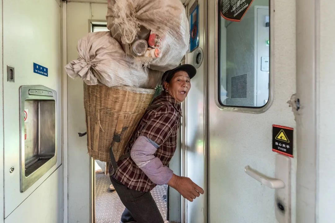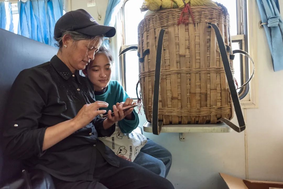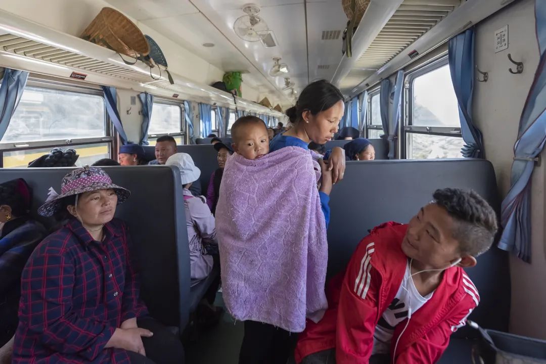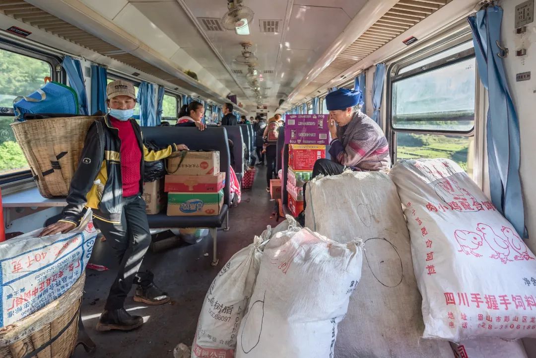 这又是一列流动的集市,当地老百姓携带的物品可以在车上进行交易。火车上,年轻的妈妈逗乐着自己的孩子,当地百姓和谐相处,祖孙俩依偎,看书写字的孩子,当地彝族老百姓正在交易着自己携带的物品,因为火车的漫长打起瞌睡的人们,也能够感受到彝族妇女的精明能干勤俭持家,看到绿皮火车为更好的服务于百姓所采取的方式,5633次列车共13节车厢,其中6节都拆除了三分之一的座位。也是为彝族百姓放置农产品、小型家禽等专门腾出的空间。针对牛、羊、猪等体型较大的牲畜,列车还专门空出一节车厢。既保证了物品运输,又让大家坐得舒服。每到周末,这趟慢车又成了凉山州最大的“校车”,搭乘着几百名孩子,在学校和家之间往返,这个时候车厢里又响起了孩子们欢快的笑声。