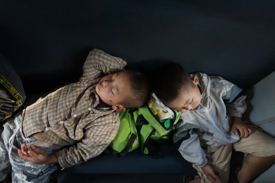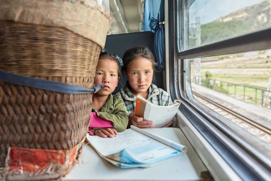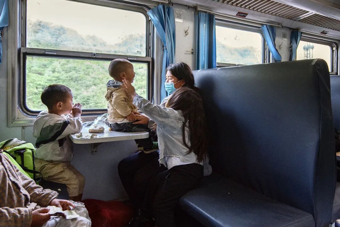慢悠悠的火车把孩子也摇睡着了。