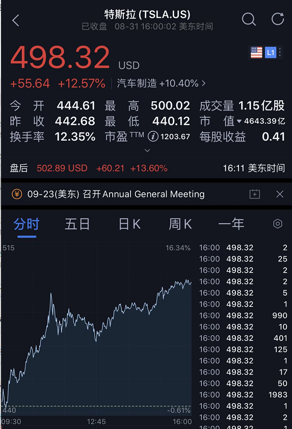 另外一边,特斯拉公司也将进行历史上首次拆股。根据公司在8月11日提交的拆股计划,每拥有1股特斯拉股票的投资者都将额外获得4股股票(相当于A股10送转40),经拆分调整后的股票将于2020年8月31日开始交易,交易价格为拆分调整后的股价。今年以来,特斯拉股价累计上涨超过400%,过去一年的涨幅更是接近900%。仅过去一个月,特斯拉股价就上涨接近50%,过去三个月涨幅达到165%。