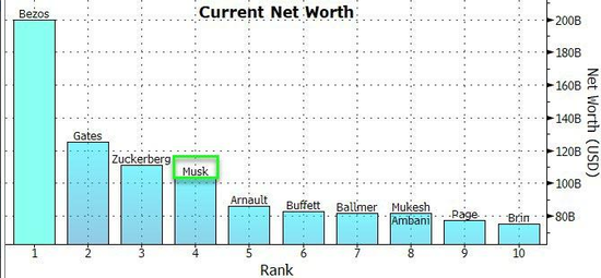 值得注意的是,就在几个月前,马斯克还加入了前10名的行列,而就在上周,随着科技股的飙升,这位特斯拉CEO加入了扎克伯格、贝佐斯和比尔•盖茨的超级富豪行列。