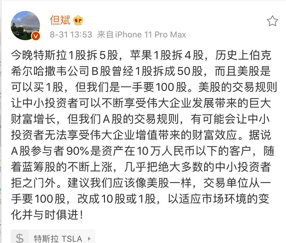 今晚特斯拉1股拆5股,苹果1股拆4股,历史上伯克希尔哈撒韦公司B股曾经1股拆成50股,而且美股是可以买1股,但我们是一手要100股。美股的交易规则让中小投资者可以不断享受伟大企业发展带来的巨大财富增长,但我们A股的交易规则,有可能会让中小投资者无法享受伟大企业增值带来的财富效应。据说A股参与者90%是资产在10万人民币以下的客户,随着蓝筹股的不断上涨,几乎把绝大多数的中小投资者拒之门外。建议我们应该像美股一样,交易单位从一手要100股,改成10股或1股,以适应市场环境的变化并与时俱进!