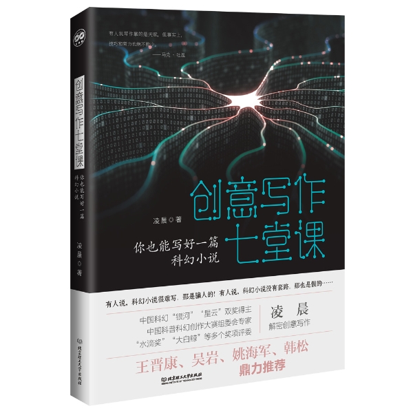 《创意写作七堂课——你也能写好一篇科幻小说》由北京理工大学出版社出版发行,是一本针对初学者不可多得的科幻小说创作教材。中国科幻小说教育家和理论家吴言先生在本书序言中所说——科幻文学与文化事业,是中国当前一个重要的、具有远见的事业,希望凌晨的努力能唤起更多人参与到科幻创作中来,能创作出更多更好的作品,丰富我们的创意文化,激发出更多伟大的科幻作品来。