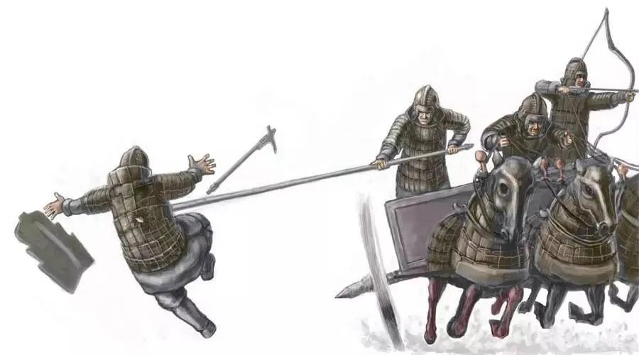 事实上,这一击十分致命,因为对方很可能是直接对着赵简子的脖子扫击的:春秋时代的戈,其实是持匕首的手的延长版:但戈援和木柲的角度大致形成了100度左右的弧度,所以戈胡部分具有更强的切割与劈砍功能,而这一结构非常有利于战车交错时的互相攻击。相比于矛,戈不仅可以啄击,而且还能横扫,非常适合车战。所幸这一击没有切中咽喉,所以赵简子侥幸躲过一劫。但是由于赵简子冲锋过于靠前,就连赵家主帅的军旗都一度被郑国人抢走,看到主帅深陷危机之中,卫太子蒯聵在战斗中拼命保护主将,并在战车陷入敌阵之后下车步战,驱散了靠近战车的敌方步兵,然后吸引敌军追击。