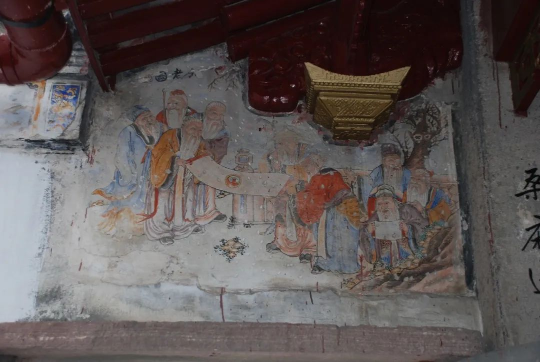 黄公祠西墙《九老图》,经宁波文物部门初步鉴定,图成于清末。这幅色彩精美的壁画长约1.1米,高0.8米,保存基本完好。可惜图上署名印章残缺,无法辨认是哪位高手所作。《九老图》的左上方,另有一幅蓝底《牡丹图》,图的下半部分色彩几乎剥落殆尽。