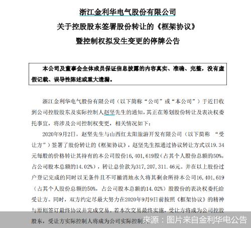 在此次控制权拟变更公告中,金利华电也透露了接盘方。具体来看,赵坚与红太阳旅游签署了股份转让的《框架协议》,赵坚拟通过协议转让方式以19.34元每股的价格转让其持有的公司股份1640.16万股(占其个人股份总额的50%,占公司股本总额的14.02%),转让总价款为3.17亿元。另外,赵坚在以上股份过户登记完成的同时以无条件且不可撤消地永久将其剩余所持公司1640.16万股股份的表决权委托给红太阳旅游。