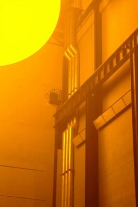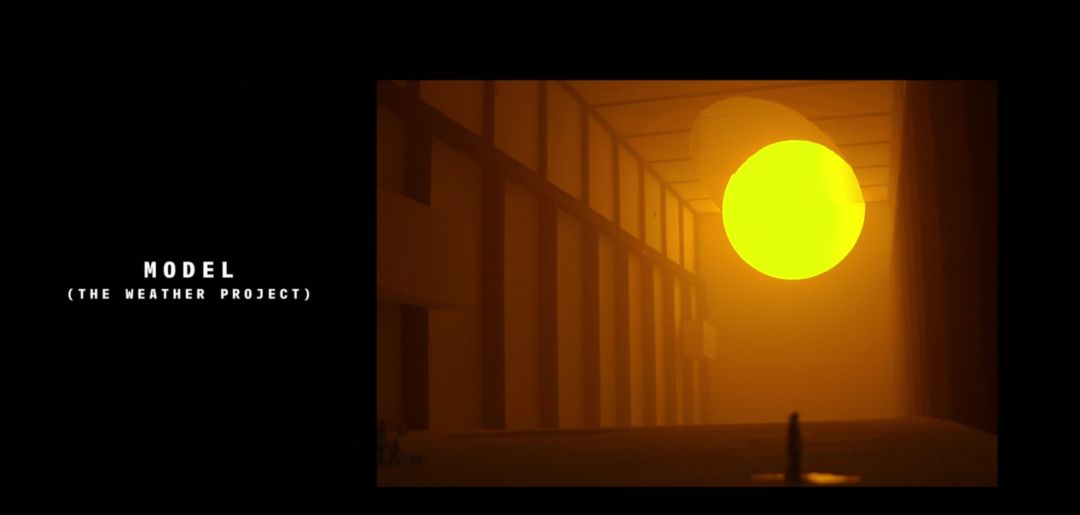 太阳的表面是一块特制的塑料板,利用镜子将所有的光融合成为一体,悬挂在高达35米的涡轮机大厅中,照亮整个展场。