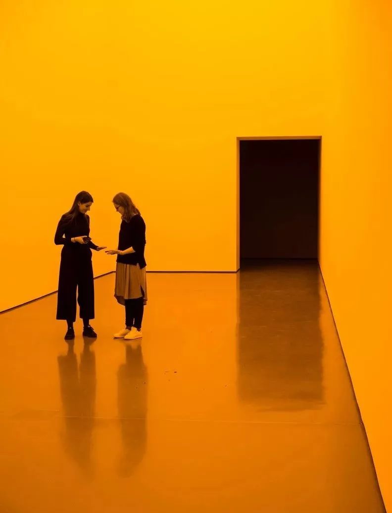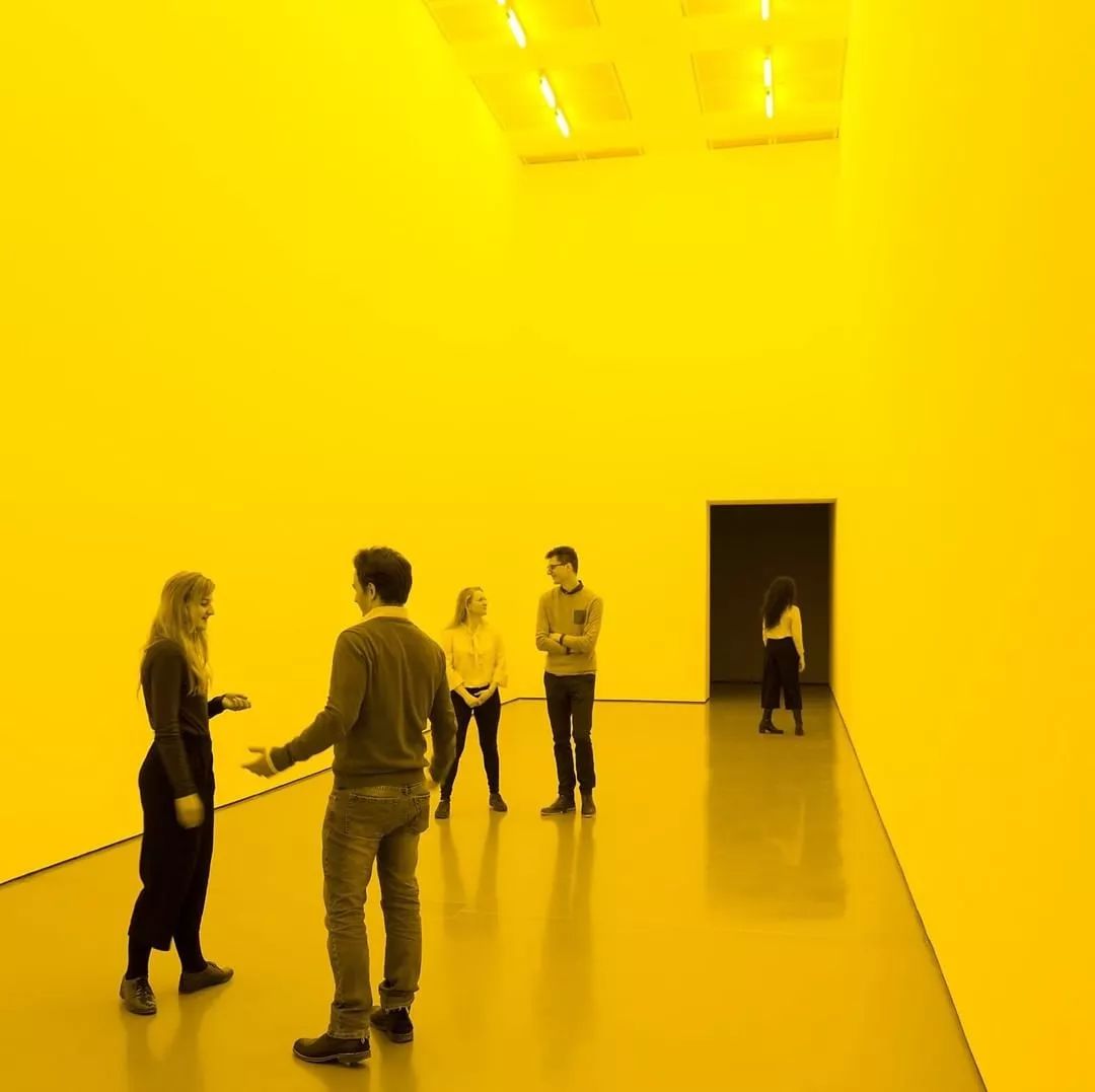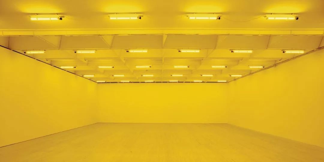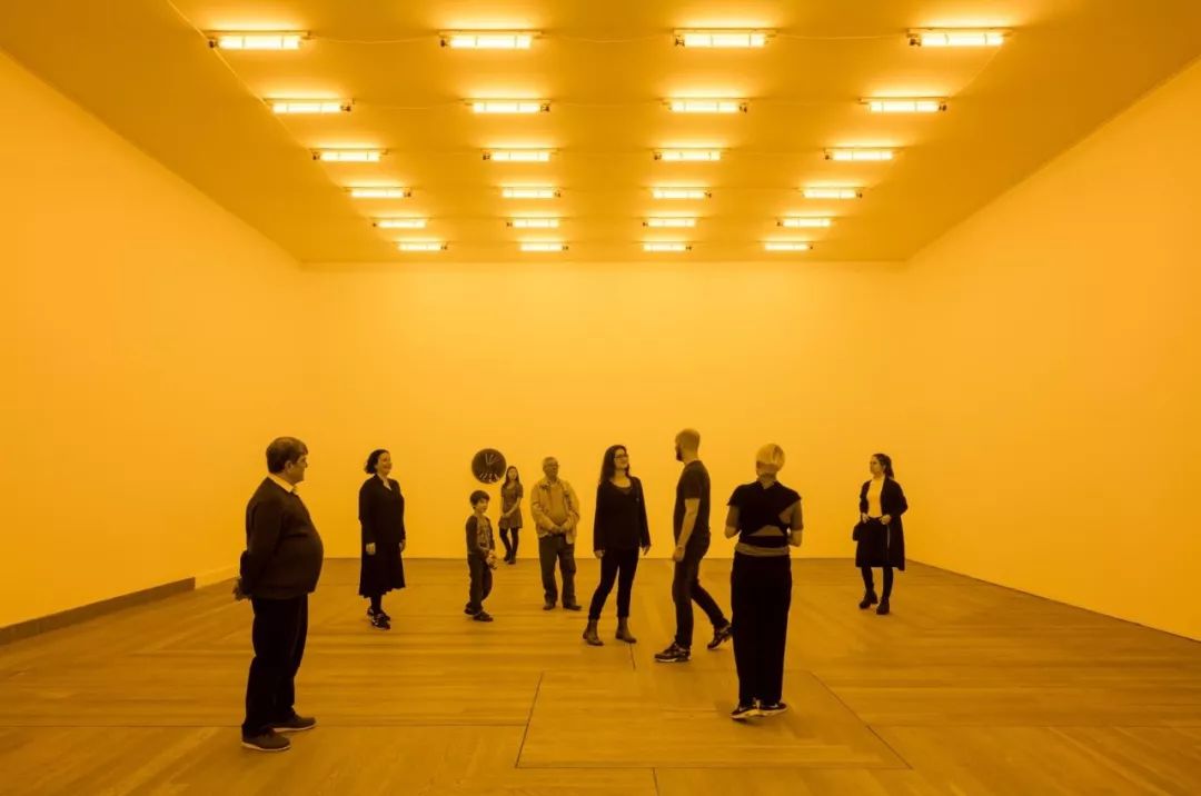 早在1997年,Eliasson 举办过一个名为「Room For One Colour」的展览,整个展厅空无一物,只有头顶的黄色灯光,观众走进来,看着彼此,看着自己的手,发现整个空间只剩下了黄色和黑色 ▽