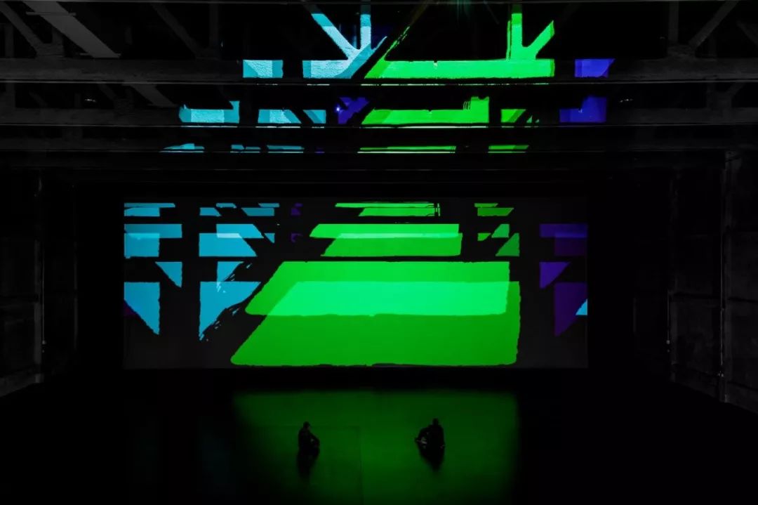 艺术家将不同颜色的三角板安装在建筑的顶部,利用多部投影机将剧院天花板原有的三角结构被重叠、交替投影在墙上,现场还配上了钢琴演奏和移动的混合声。