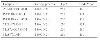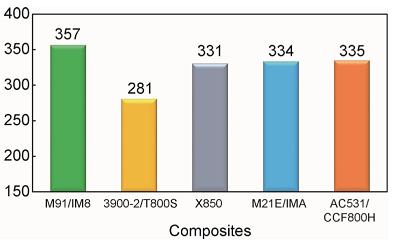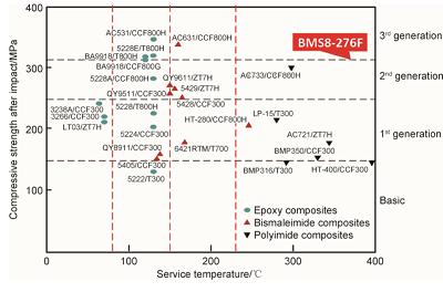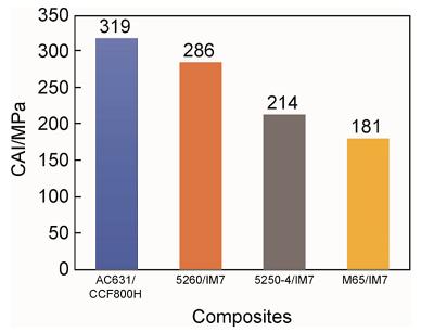 20世纪90年代初,国内开始了双马来酰亚胺树脂基复合材料的研究,逐步形成了以5405和QY8911为代表的第一代韧性双马来酰亚胺T300级碳纤维增强复合材料和以5429,5428和QY9511,QY9611为代表的第二代韧性双马来酰亚胺高强型碳纤维(T300级和T700级)复合材料体系,也成功开发了第三代韧性水平的AC631高韧性双马来酰亚胺树脂高强中模碳纤维复合材料,AC631/CCF800H双马树脂基复合材料的冲击后压缩强度显著提升(图4),与美国最先进战斗机应用最广的复合材料的力学性能比较,其综合力学性能优于国外相关高强中模碳纤维双马来酰亚胺复合材料5250-4/IM7。