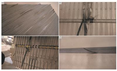 图6是自动丝束铺放工艺常见问题。因此,这3种工艺对预浸料的要求从高到低的顺序是:自动铺丝>自动铺带>手工铺贴。为了满足3种预浸料按照统一的技术要求,基于国内尚未有成熟的自动铺丝预浸料的相关技术经验,航空工业复合材料技术中心优化高强中模高韧性树脂基复合材料预浸料制备工艺,解决了AC531/CCF800H和AC631/CCF800H预浸料黏性控制、分切工艺、预浸丝束接头连接方法等关键技术,形成了自动铺放预浸带和预浸丝束的生产规范、评价方法和相关技术标准,实现了一种预浸料同时满足3种铺贴工艺的严格技术要求,在工程应用中获得了应用验证。