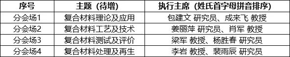 本次会议采用征集论文简报的形式进行征稿,目前拟筹备以下四个分会场,涵盖复合材料各个方面,其中分会场主题及分会场执行主席为: