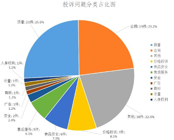 2020年8月,全市各级12315投诉举报机构共接到各类消费者投诉103件,其中商品类投诉61件,服务类投诉42件。其中符合受理条件的有82件,调解成功51件,诉转案1件,争议金额13.31万元,挽回经济损失7.42万元。申诉内容主要集中于质量问题、合同问题、价格问题、食品安全问题等。