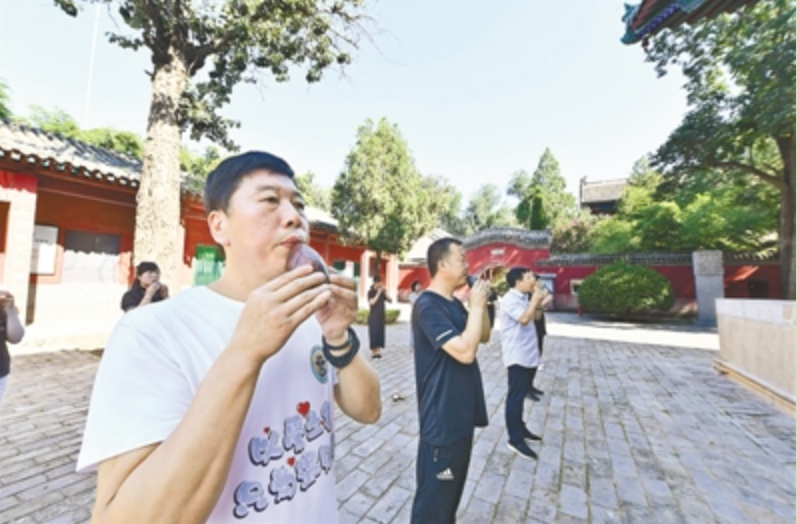 记者一行走进武陟县嘉应观时,武陟县嘉应观景区管理局党支部书记翟嵩峰正和一群黄河泥埙爱好者在景区内排练,如泣如诉的埙声仿佛在诉说着来自远古的记忆,让古朴的园林更加静谧庄重。