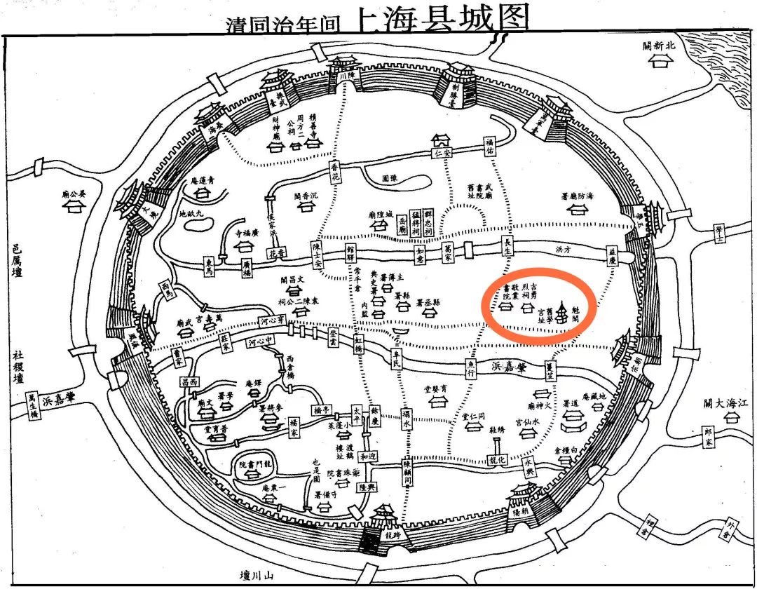同治上海县城图。图中标记处为上海城内旧学宫,广方言馆初设旧址即在此处。