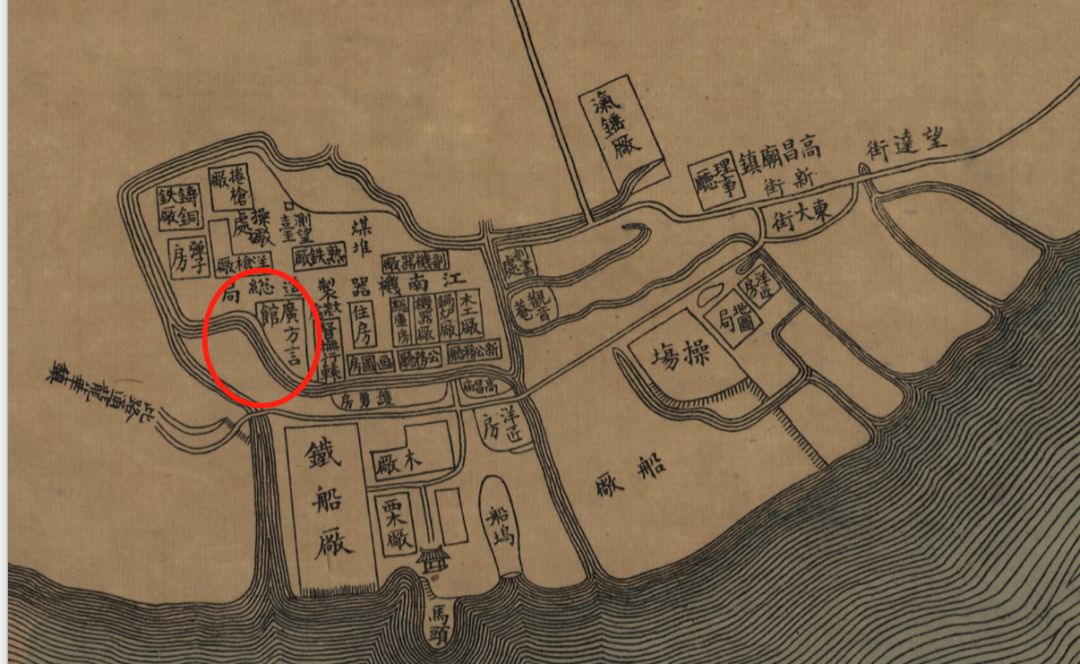 1884年上海县城乡租界图局部,此片为江南制造总局,图中可见其西南角为广方言馆。