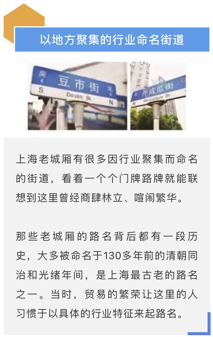 除了用行业特征命名外,当时上海还有以标志性建筑物来命名街道的案例。例如黄浦区的巡道街,清朝时这里是江苏省政府在上海设立的派出机构,路名叫做“苏淞太兵备道”,简称巡道街。该街一旁有条“天灯弄”,天灯即路灯,当时只有在重要机构门前才设置路灯,这里也是那时上海唯一有路灯的地方,故而得名。