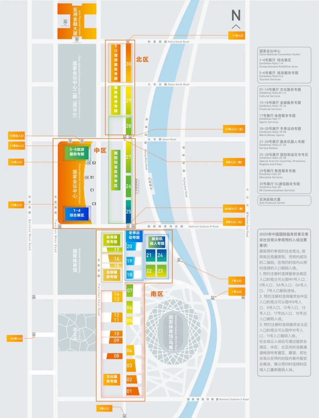 2. 预约时选择服贸会中区入口的观众可从8号入口、9号入口、12号入口、13号入口、17号出入口、18号出入口刷码入场。