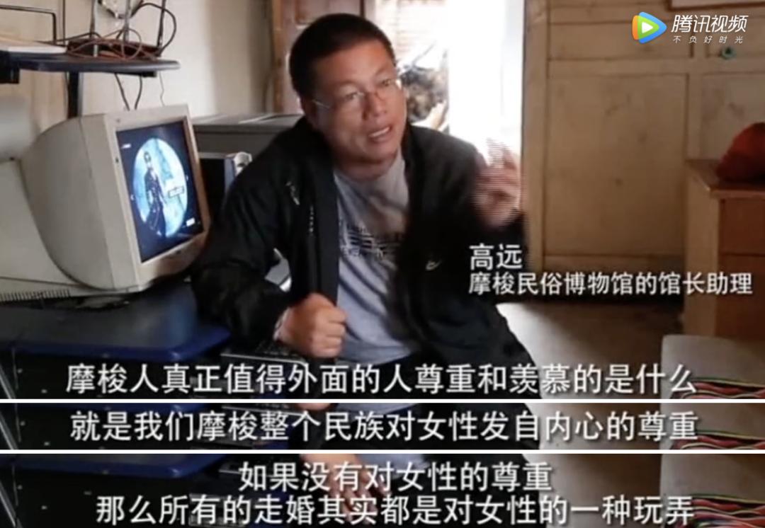 “摩梭人没有处女这个概念,看人不能这样看,对女人要很尊重。不尊重妇女,就等于不尊重自己的母亲。”