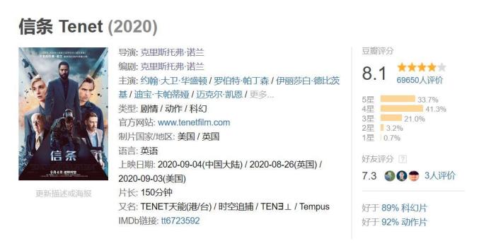 《信条》是克里斯托弗·诺兰执导的第11部长片,在不少观众心目中,诺兰就是“品质的保证”,在豆瓣,诺兰多部作品都保持着8、9分以上的高分,而在电影院,近期复映的《星际穿越》《盗梦空间》分别取得了1.21亿和3000万左右的票房成绩。