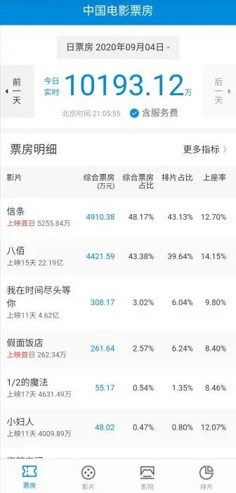 9月4日,《信条》在国内上映,根据国家电影专资办数据,截至4日21时,《信条》排片占比43.13%,《八佰》排片占比39.64%,同一天首映的《假面饭店》仅有6.24%。从票房数据来看,全国单日票房终于在9月份以后首次破亿,但是,《信条》和《八佰》的综合票房差距并不大。