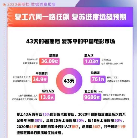 近日,猫眼研究院联合微博发布《2020年暑期档数据洞察报告》,数据显示,今年43天的暑期档累积观影人次突破1.03亿,总票房36.09亿元,并于最近11天连续取得单日票房破亿元的成绩。