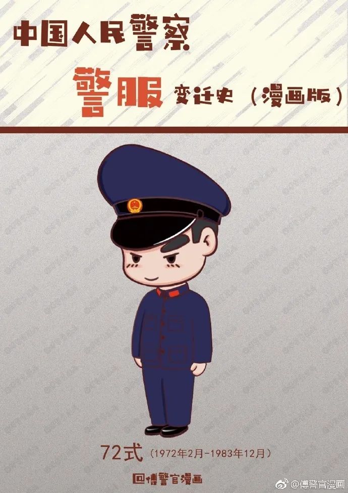 “七二式”警服冬夏装上下均为藏蓝色。恢复“五五式”警服大檐帽式样,保留软式解放帽,均为藏蓝色。帽徽为红漆底圆形,中心凸压国徽。