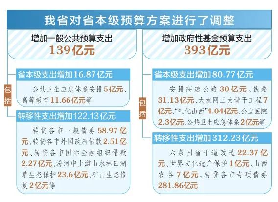 在增加一般公共预算支出139亿元中,包括省本级支出增加16.87亿元,转移性支出增加122.13亿元。前者包括公共卫生应急体系安排5亿元、高等教育11.66亿元等;后者包括转贷各市一般债券58.97亿元、转贷各市外国政府借款2.51亿元、转贷各市国际金融组织借款2.27亿元、汾河中上游山水林田湖草生态保护23.6亿元、矿山生态修复2亿元等。