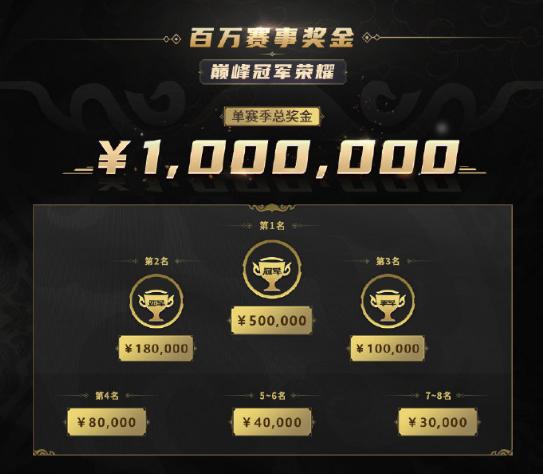 首届武神坛巅峰赛总奖金池高达100万,冠军奖金更是高达50万。每个赛季官方还将为战队提供近百万的专项薪资补贴。此外,游戏内为所有8强战队准备了S1赛季专属的锦衣道具,冠军战队还将解锁唯一的火焰特效。除此之外,冠军战队还将获得巅峰赛定制奖杯奖牌、武神坛冠军殿堂、游戏道具等一系列专属荣耀。