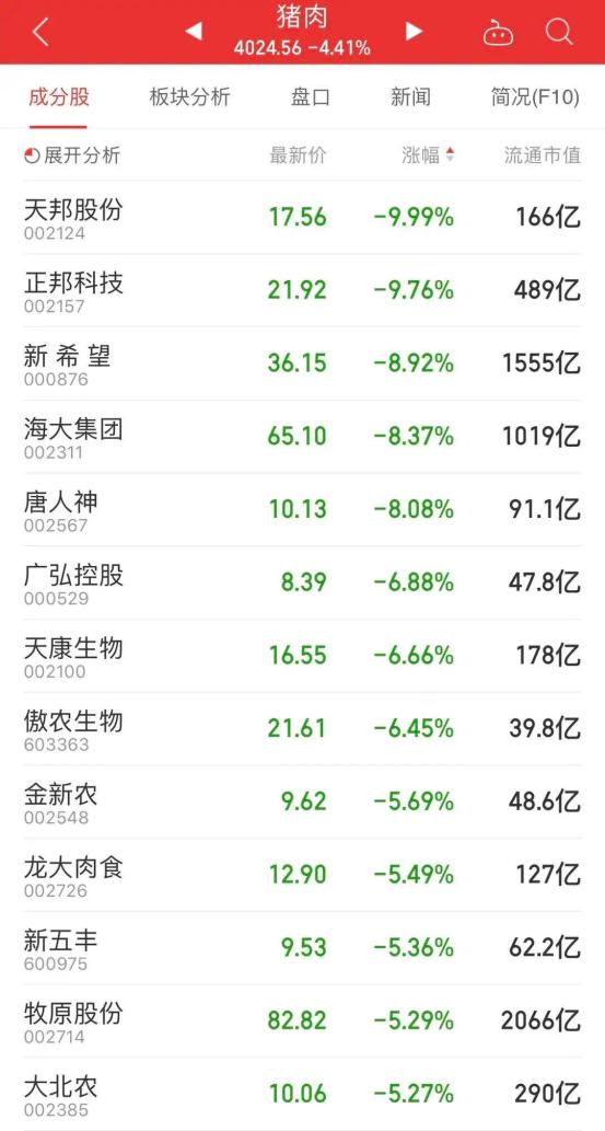 今日(9月7日)猪肉概念股跌4.41%领跌两市场,截至收盘,天邦股份和正邦科技跌停,新希望盘中一度触及跌停,尾盘回调收跌8.92%,海大集团收跌8.37%,牧原股份、天康生物、傲农生物等纷纷跌超5%。