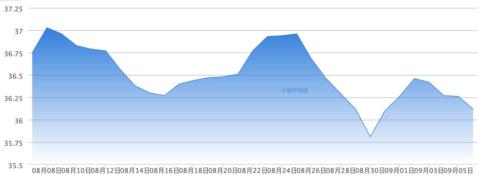 中国养猪网猪价系统数据监测显示,9月份的第一周,各品种生猪均维持下跌态势。9月5日,各品种生猪价格延续4日的下跌势,环比跌幅均超2%。数据显示,5日外三元生猪均价为36.87元/公斤,猪价较前日下跌了0.07元/公斤,环比下降2.61%,同比增加35.95%;内三元生猪均价为36.26元/公斤,猪价较前日下跌了0.01元/公斤,环比下降2.37%,同比增加38.77;土杂猪生猪均价为35.78元/公斤,猪价较前日下跌了0.05元/公斤,环比下降2.40%,同比增加39.33%。下图为生猪(内三元)价格近1个月的走势。