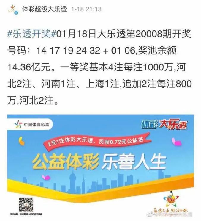 1月18日,大乐透第20008期开奖,河北命中2注追加投注一等奖。数据显示,这张彩票出自石家庄同一家体彩实体店,位于石家庄栾城区东尹村,中奖彩票为一张2倍30元投入的单式追加票,单票擒奖3600万元。