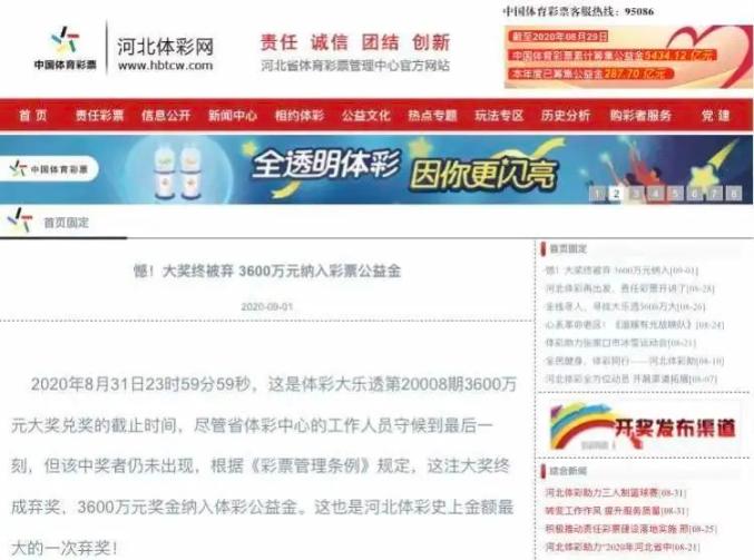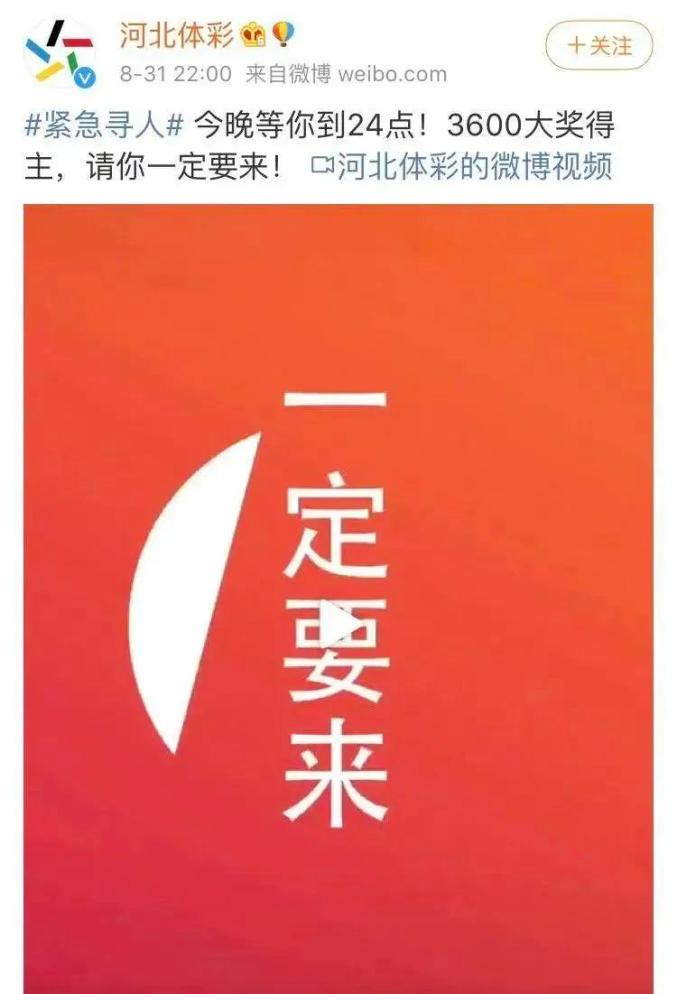 北京时间8月31日22:00,河北体彩还在官方微博用力呐喊:“今晚等你到24点,3600(万)大奖得主,请你一定要来!”