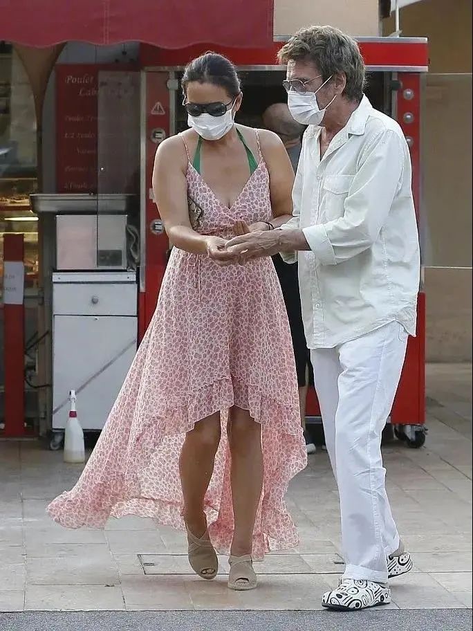 有媒体报道了粉嫩吊带裙的巩俐与老公让•米歇尔•雅尔现身街头。