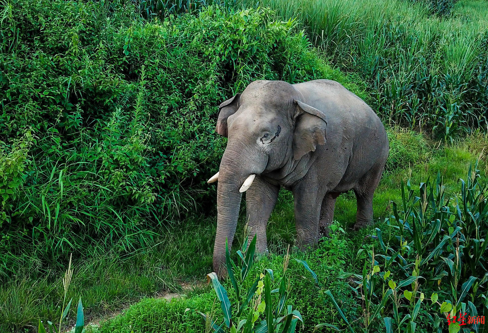 9月2日,杨所且带红星新闻观测这个象群的一头独象,远远望去,这头独象在山地间闲庭信步。杨所且说,公象“三三两两”活动,发情时才与母象作一处。监测员们根据个体大小,将象群中的9头公象取名为“象老大”至“象老九”,而这头独象是“象老二”,是象群领导地位之争的失败者。