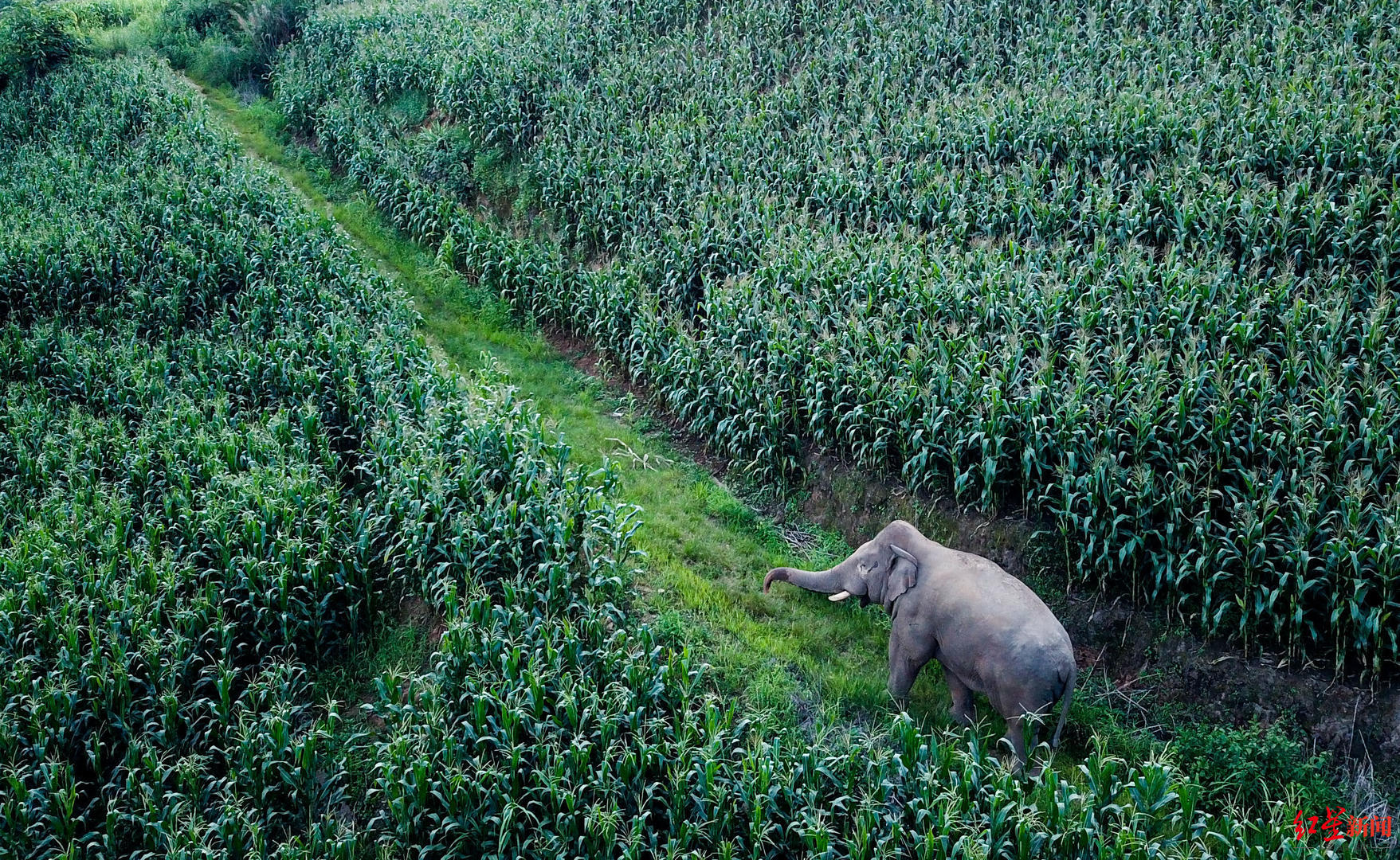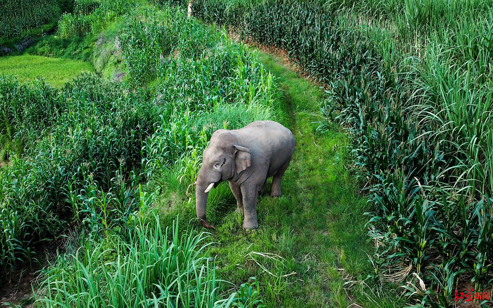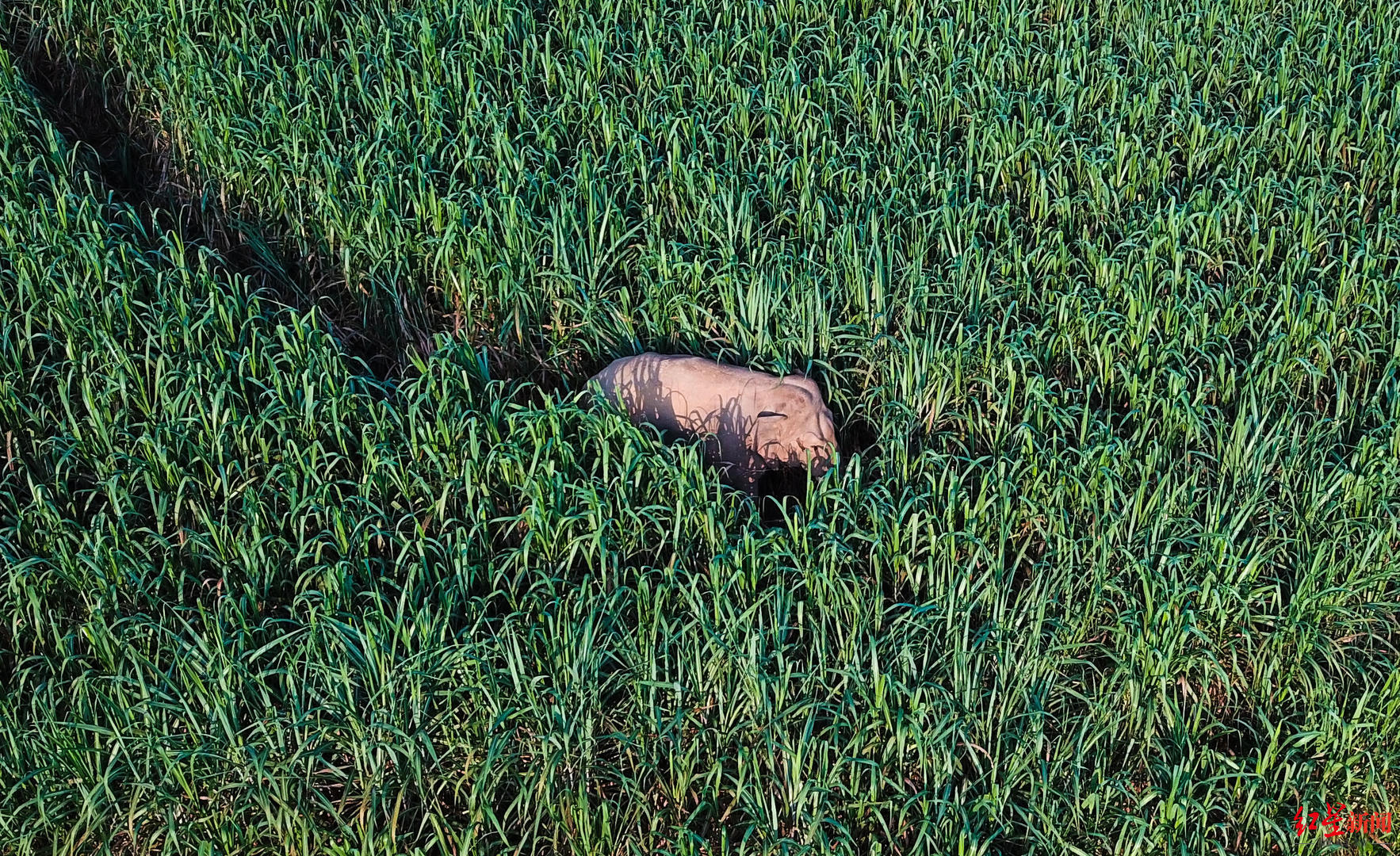 澜沧县发展河乡黑山村台地梁子,在甘蔗地、玉米地觅食的野生象。