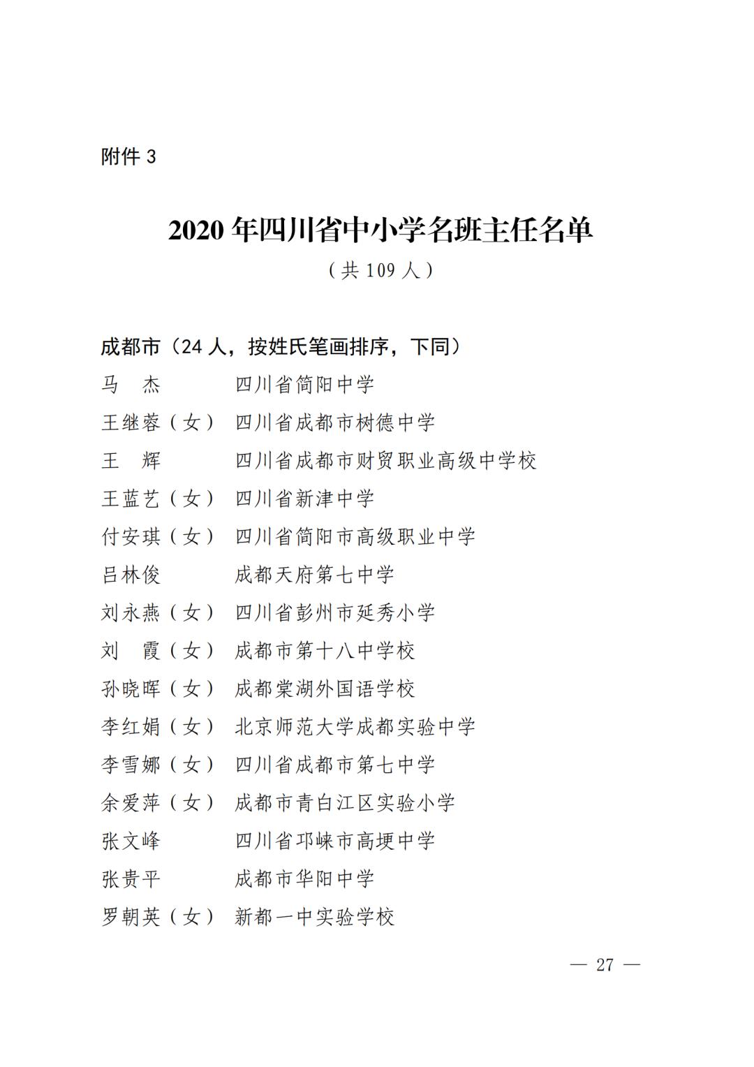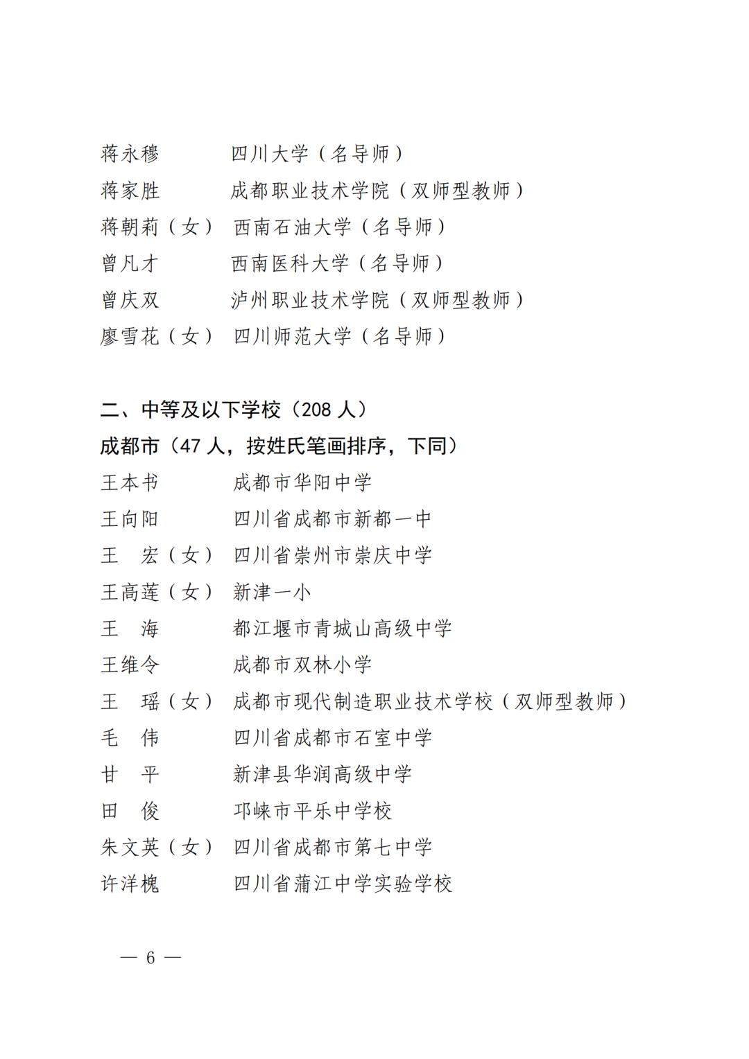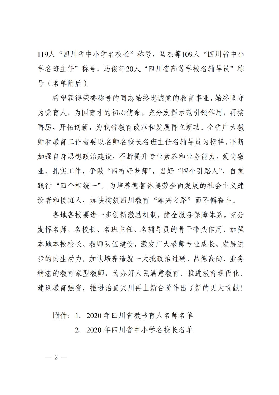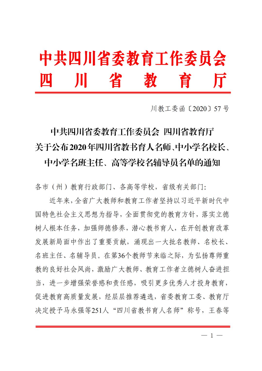 经层层推荐遴选,省委教育工委、教育厅决定授予马永强等251人“四川省教书育人名师”称号,王春等119人“四川省中小学名校长”称号,马杰等109人“四川省中小学名班主任”称号,马俊等20人“四川省高等学校名辅导员”称号。